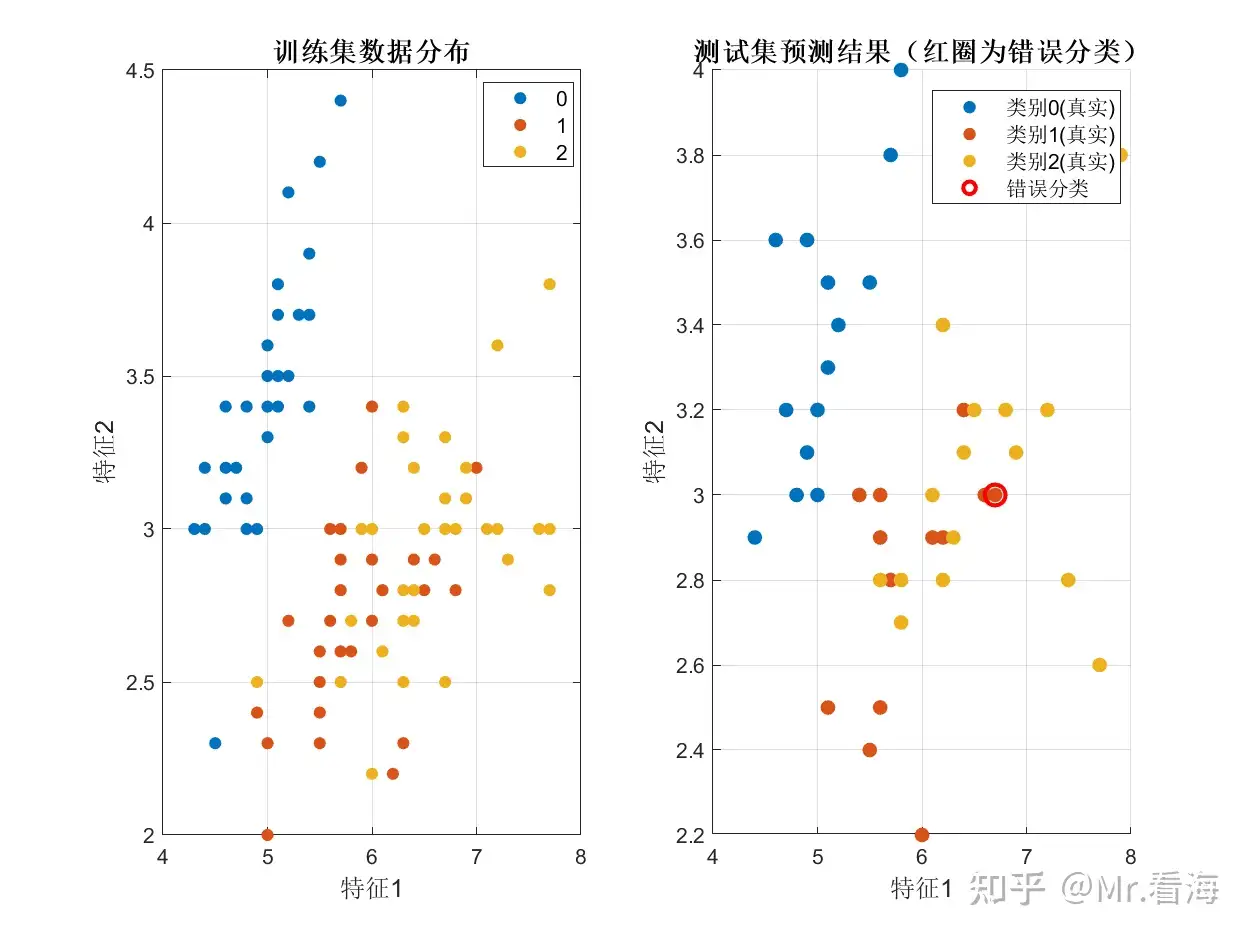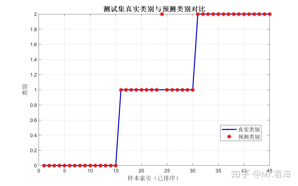 这张图直观地展示了每个样本的预测情况。横坐标是样本编号,纵坐标是类别标签(0、1、2),蓝色'o'是真实类别,红色'x'是预测类别。两者完全重合,说明所有样本都预测正确!
