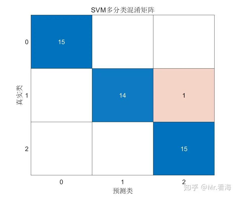 混淆矩阵是评估分类器性能的重要工具。对角线表示分类正确的样本数(这里都是15、14、15),非对角线表示分类错误的样本数(这里都是0)。所有非对角线元素都是0,说明达到了100%的准确率,这是一个完美的结果!