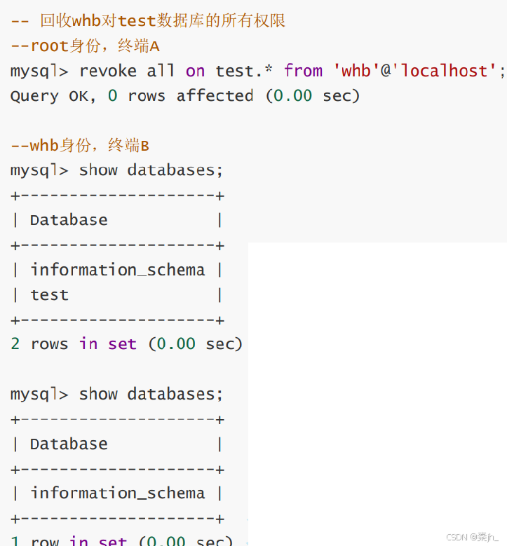 revoke 权限列表 on 库.对象名 from '用户名'@'登陆位置';