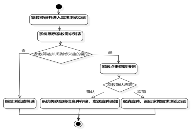在流程开始时,家教用户登录系统并进入家教需求浏览页面。随后,系统展示所有家长发布后的家教需求信息列表,其中包含需求标题、教学要求以及经验要求等。家教可根据自己的条件筛选合适的需求。当家教找到感兴趣的家教需求后,点击“应聘”按钮。系统弹出应聘确认窗口,提示家教“您确定要应聘这个家教需求吗?”。如果家教点击“确定”,系统将家教的应聘信息与该家教需求关联起来,存储到数据库中,并向家长发送一条应聘通知。如果家教点击“取消”,应聘操作取消,返回家教需求浏览页面。家教应聘家教活动图如图3-4所示。