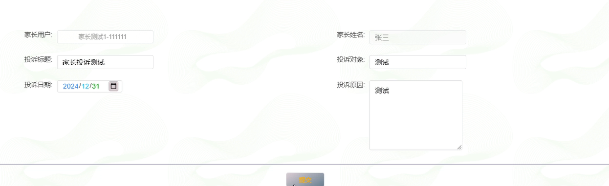 测试家长投诉功能正常性 | 1. 家长用户已登录框架 2. 家长有投诉需求 3. 系统支持投诉功能 | 1. 登录家长账号 2. 进入家长投诉模块 3. 输入投诉内容及原因 4. 提交投诉 5. 确认投诉已成功记录 6. 验证投诉能在后台查看 | 投诉内容正确提交,能够在后台进行查询并表现相关记录 | 是 |