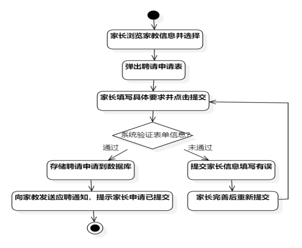 在流程开始时,家长在浏览家教信息后,选择一个合适的家教并点击“聘请”按钮。随后,系统弹出聘请申请表单,要求家长填写聘请的具体要求(如授课时间、授课内容等)。家长填写完成后,点击“提交”按钮。系统对表单内容进行验证。如果验证借助,系统将聘请申请存储到数据库中,并向家教发送一条应聘通知,同时提示家长“聘请申请已提交”。如果验证未通过,环境会提示家长“信息填写有误,请完善后再提交”。家长提交家教聘请申请活动图如图3-3所示。