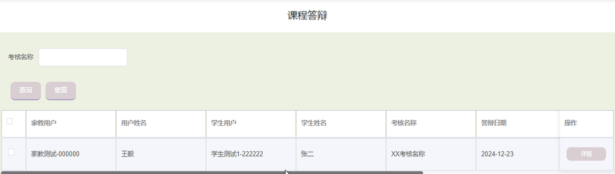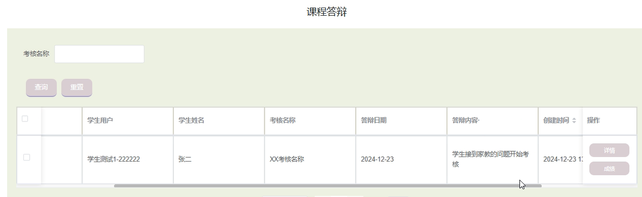 学生许可查询课程考核相关信息,包括考核内容、答辩时间等,了解自己在课程中的表现。课程考核界面如图6-23所示。