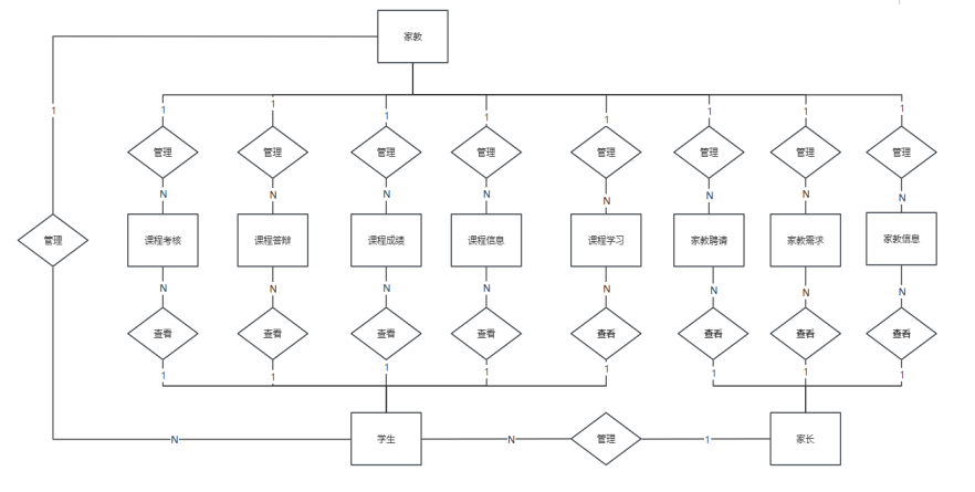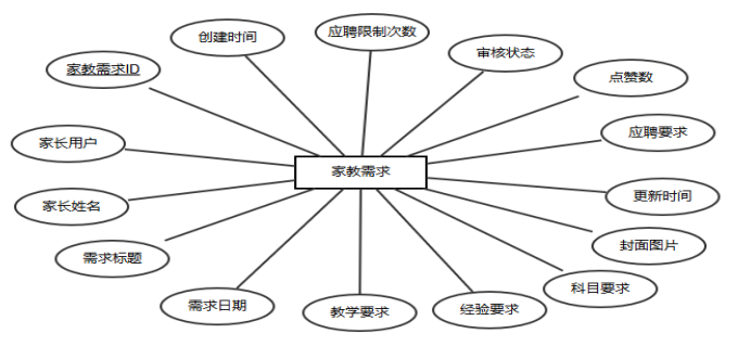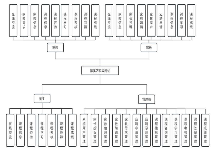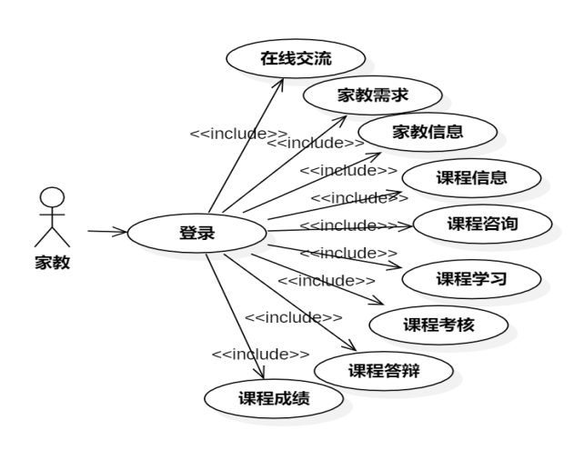 教师可能与家长、学生进行在线交流,查看、添加、删除家教信息。教师可以对家教需求进行点赞、收藏、应聘和评论。教师还可以查看和添加课程信息,回复课程咨询。教师可查询课程学习进度、参与课程考核,编辑考核内容,参与课程答辩并评分。教师负责对课程成绩进行打分。家教功能表如表3-1所示。