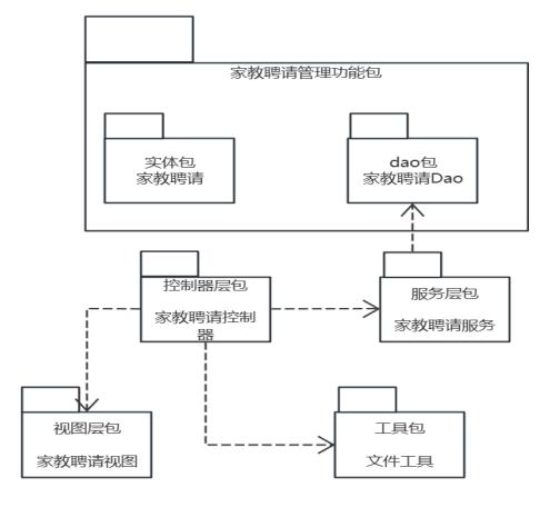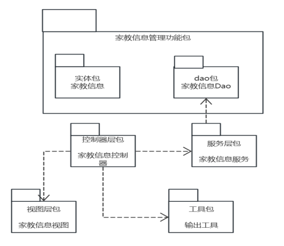 家教信息管理功能的包图由五个主要部分组成:实体包、DAO包、控制器层包、服务层包和视图层包。实体包包含家教信息类,DAO包囊括家教信息Dao,负责信息访问。控制器层包含家教信息控制器,处理用户请求。服务层包括家教信息服务,封装业务逻辑。视图层包括家教信息视图,展示用户界面。工具包给出通用输出器具,支持系统特性。家教信息管理包图如图4-2所示。