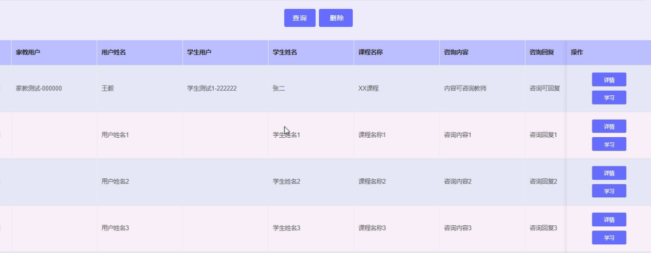 管理员可以查询、删除课程咨询记录,帮助管理用户的课程问题。课程咨询管理界面如图6-34所示。