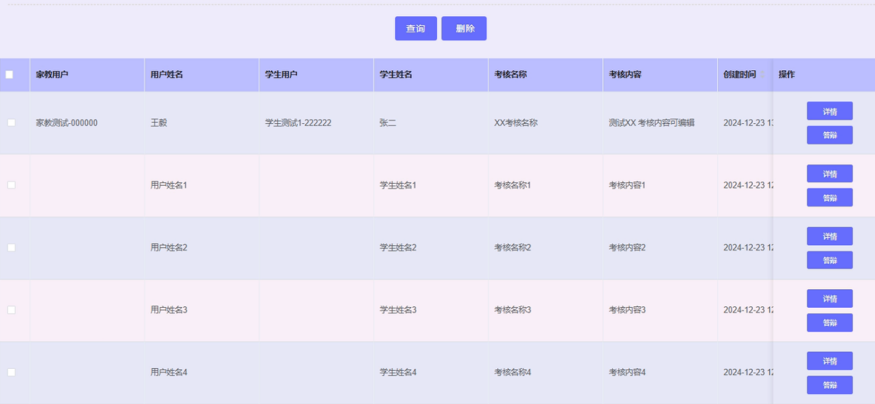 经过对家教功能、家长特性和管理员功能模块的测试,所有功能均按预期运行。在线交流模块能够正常发送和接收消息。家长投诉功能正常,家长能够成功提交投诉并在后台查看相关记录。系统用户管理功能也能稳定工作,管理员能够顺利查询、删除和添加用户信息,并且操作实时生效。测试过程中没有出现系统崩溃或严重错误,所有操作均能够在规定时间内完成,且结果与预期一致。总体来说,系统在这些关键功能模块中的表现符合设计要求,未发现重大缺陷。