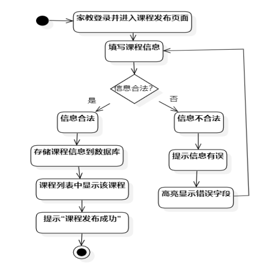 在流程开始时,家教用户登录系统并进入课程发布页面。随后,家教填写课程信息,包括课程名称、授课内容、授课时间、课程价格等。填写搞定后,家教点击“发布”按钮。系统对输入的信息进行合法性检查。倘若信息合法的话,系统就会把课程信息储存到数据库里面,并且会在课程列表信息中显示该课程,同时提示家教“课程发布成功”。倘若信息不合法,体系会提示家教“信息填写有误,请完善后再发布”,并高亮显现错误字段。家教发布课程信息活动图如图3-1所示。