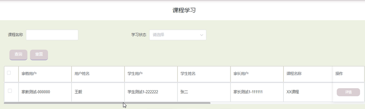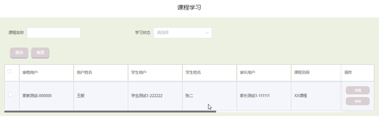 管理员可以查询、删除、考核课程学习情况,保证学生的学习进度与考核结果符合要求。课程学习管理界面如图6-35所示。