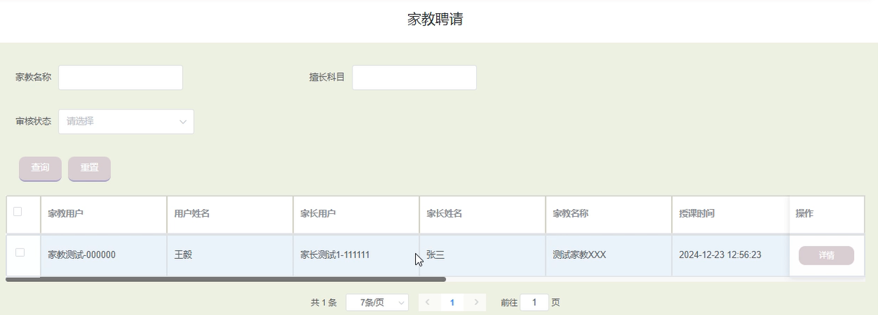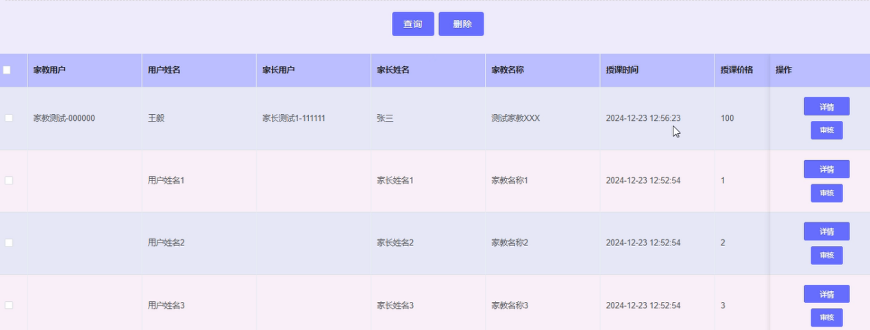 管理员能够查询、删除、审核家教聘请记录,管理家教与家长之间的聘请关系。家教聘请管理界面如图6-29所示。
