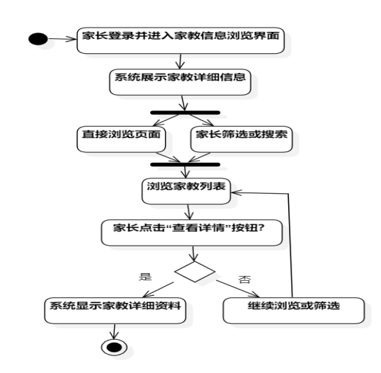 通过在流程开始时,家长用户登录系统并进入家教信息浏览页面。随后,系统展示所有家教的详细信息,包括家教姓名、联系方式、擅长科目、教学经验等。家长能够根据科目、家教姓名等条件进行筛选和搜索。当家长找到感兴趣的家教时,点击“查看详情”按钮。系统呈现该家教的详细资料,包括教学风格、过往评价等内容。家长浏览家教信息活动图如图3-2所示。