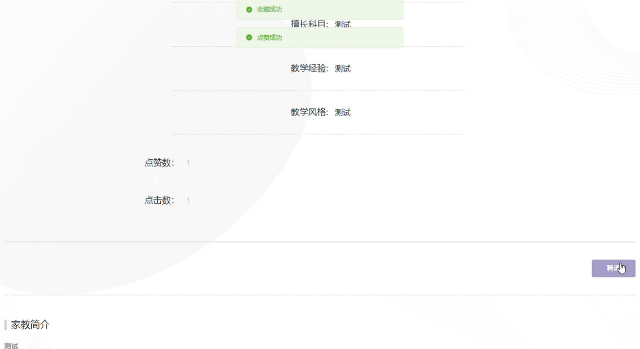 通过家长能够查看家教信息,包括家教的资历、授课内容、收费标准等,家长还可对家教进行点赞或收藏,方便筛选合适的家教。家教信息界面如图6-11所示。