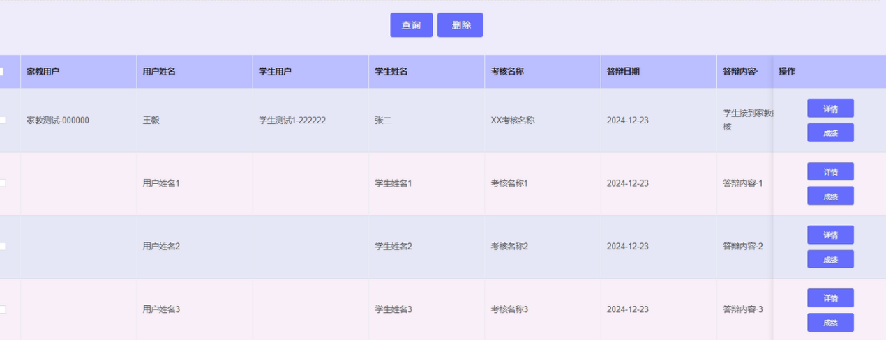 管理员能够查询、删除、审核课程答辩结果,处理成绩反馈。课程答辩管理界面如图6-37所示。