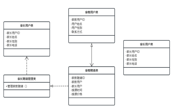 此类图描绘了家教聘请管理系统的结构。图中含有三个类:家长用户类、家教用户类和家教聘请类。家长用户类和家教用户类都涵盖用户ID、姓名、性别和联系方式等属性。家教聘请类包含家教聘请ID、家教用户、家长用户、授课时间和授课价格等属性。家长聘请管理类负责管理家教聘请,与家教聘请类之间存在管理关系。家教聘请管理功能类图如图4-6所示。