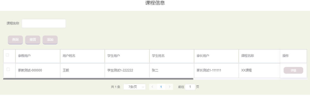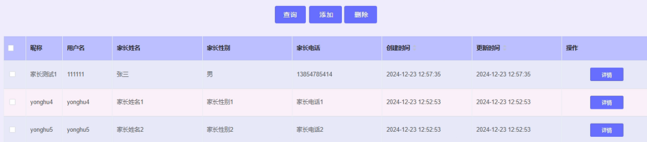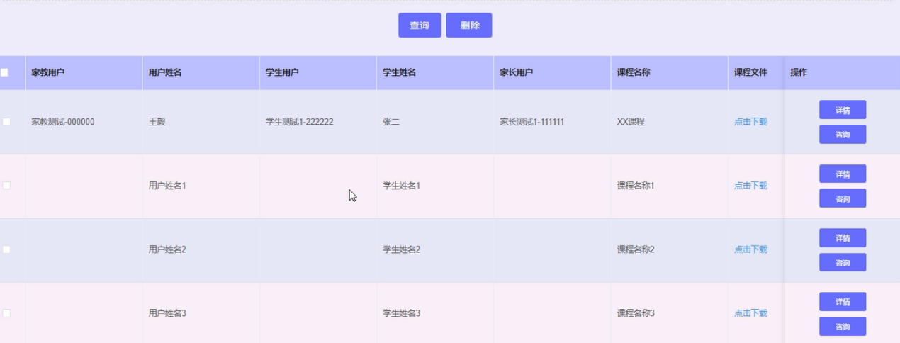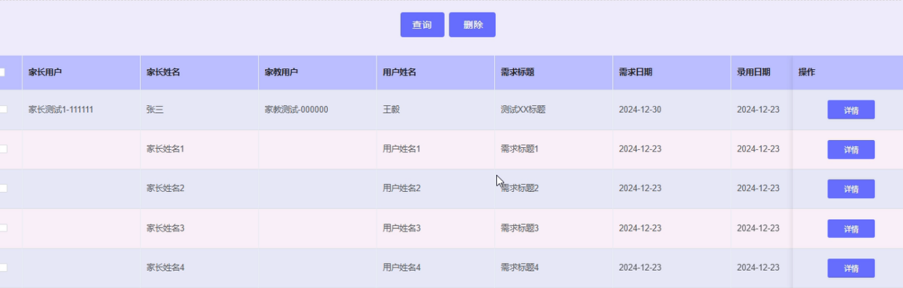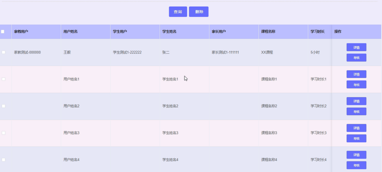 管理员可以查询、删除或添加家教用户、家长用户及学生用户。框架用户管理界面如图6-26所示。