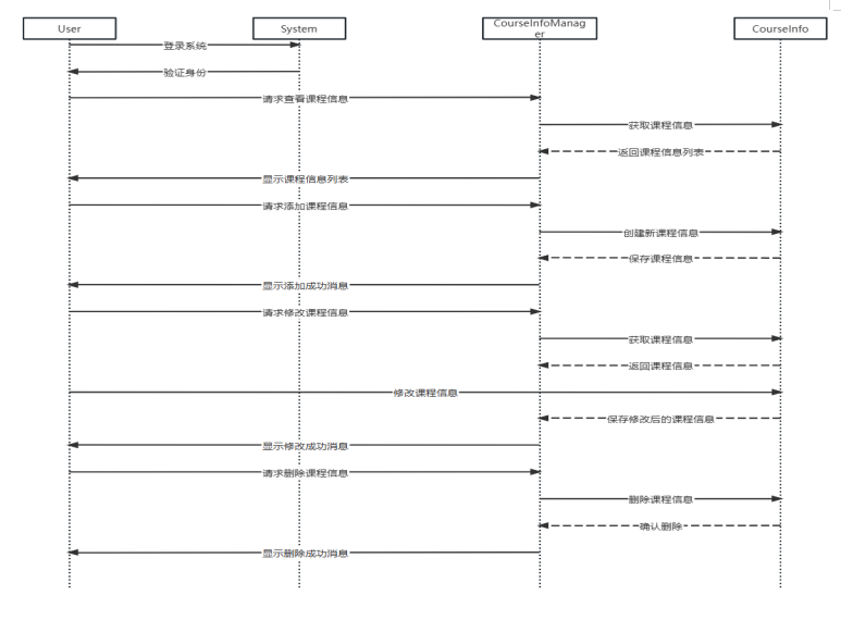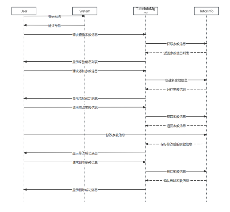 用户首先登录系统并进行身份验证。验证通过后,用户行请求查看家教信息,系统从tutorInfoMgmt模块获取家教信息并返回列表。用户可以选择添加、修改或删除家教信息,框架执行相应的CRUD操作,并在操作成功后向用户显示消息。这一流程体现了家教信息管理系统的动态行为和交互过程。家教信息管理时序图如图4-4所示。