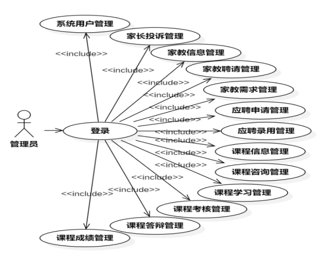 管理员管理系统中所有用户,包括家教、家长、学生的查询、删除、添加。管理员处理家长投诉,审核相关内容。管理员负责家教信息管理、家教聘请和家教需求的管理。管理员管理应聘申请,审核并录用家教。管理员可查询、删除、添加课程信息,献出咨询和文件下载。管理员管理课程考核、答辩及成绩。管理员功能表如表3-4所示。