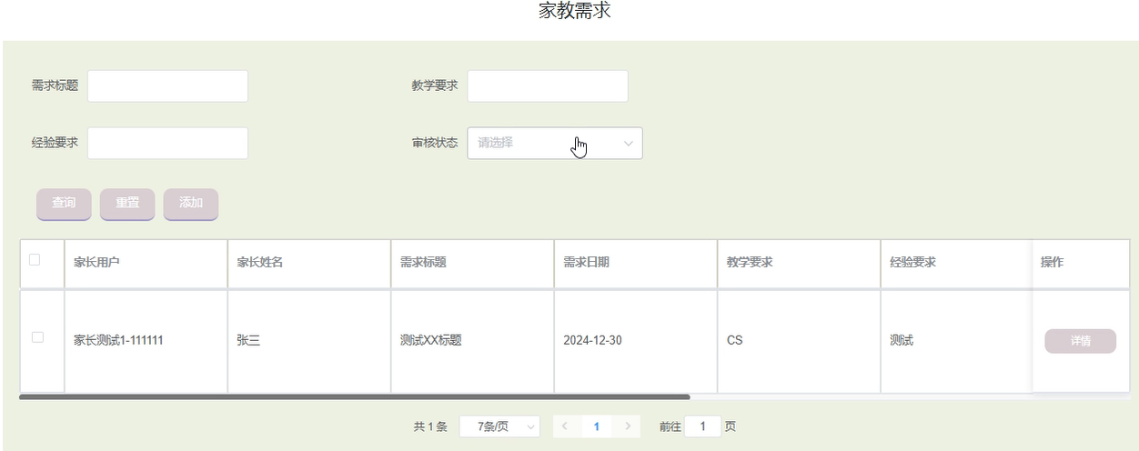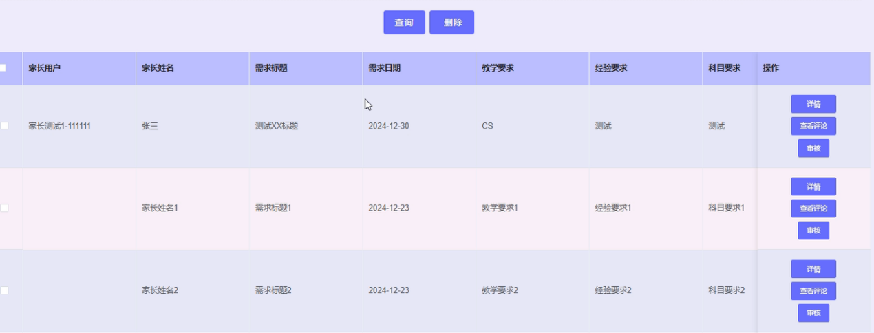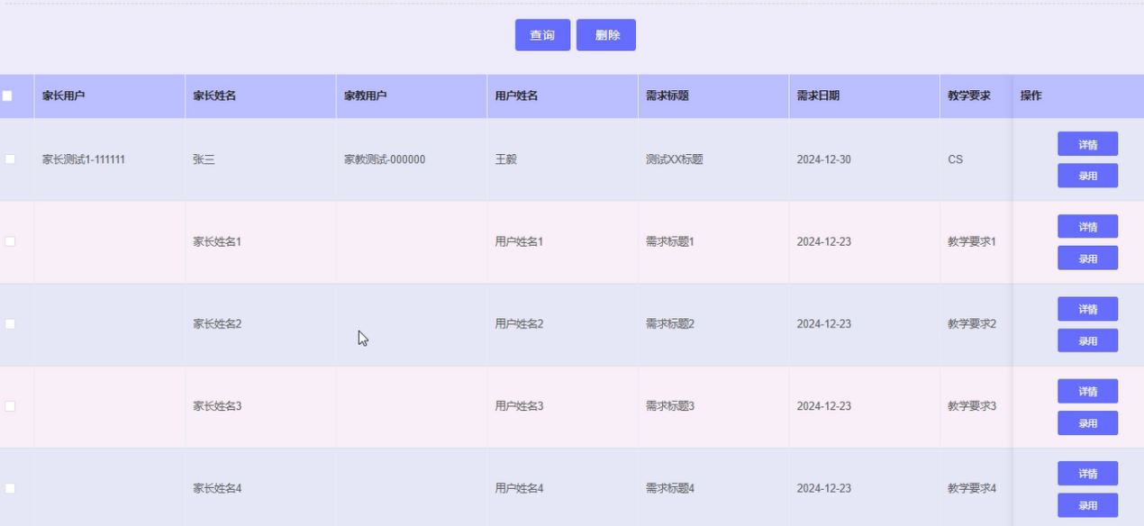 通过管理员能够查询、删除、添加家教需求,审核需求内容的真实性。家教需求管理界面如图6-30所示。