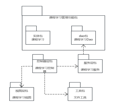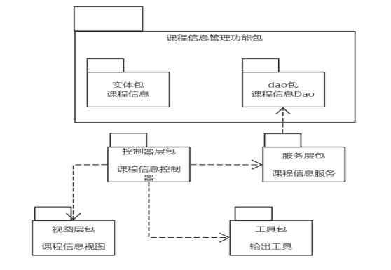 课程信息管理功能的包图展示了该功能模块的结构,包括实体包、DAO包、控制器层包、服务层包、视图层包和工具包。实体包存储课程信息类,DAO包处理课程信息Dao。控制器层的课程信息控制器管理用户请求。服务层的课程信息服务执行业务逻辑处理。视图层的课程信息视图负责用户界面展示。工具包中的输出工具支持系统输出功能。课程信息管理包图如图4-8所示。