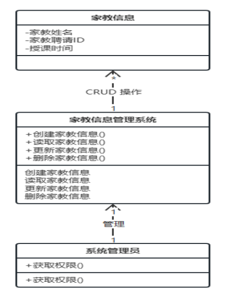 CRUD操作关系。家教信息管理功能类图如图4-3所示。就是该类图展示了家教信息管理系统的结构。系统管理员经过“获取权限”方法与家教信息管理系统交互,管理系统负责处理家教信息的CRUD(创建、读取、更新、删除)管理。家教信息类含有家教姓名、家教聘请ID和授课时间等属性。系统管理员与家教信息管理系统之间是管理关系,管理系统与家教信息类之间