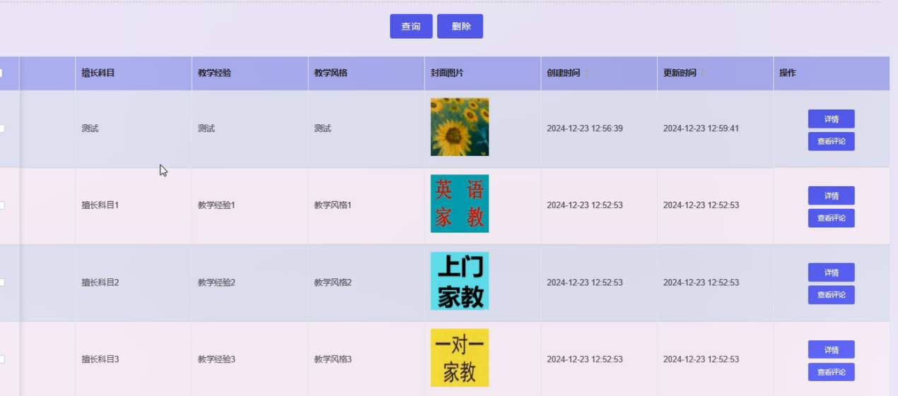 管理员可以查询、删除、添加家教信息,并查看用户对家教的评论。家教信息管理界面如图6-28所示。