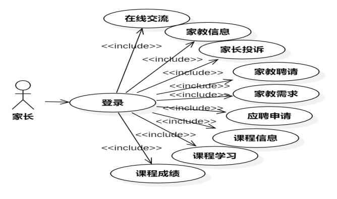 家长行与教师进行在线沟通,查看、点赞、收藏、聘请家教。家长可以提交投诉并记录日期和原因。家长可查询家教聘请情况,查看和添加家教需求。家长可以查询课程信息、学习进度和课程成绩。家长功能表如表3-2所示。