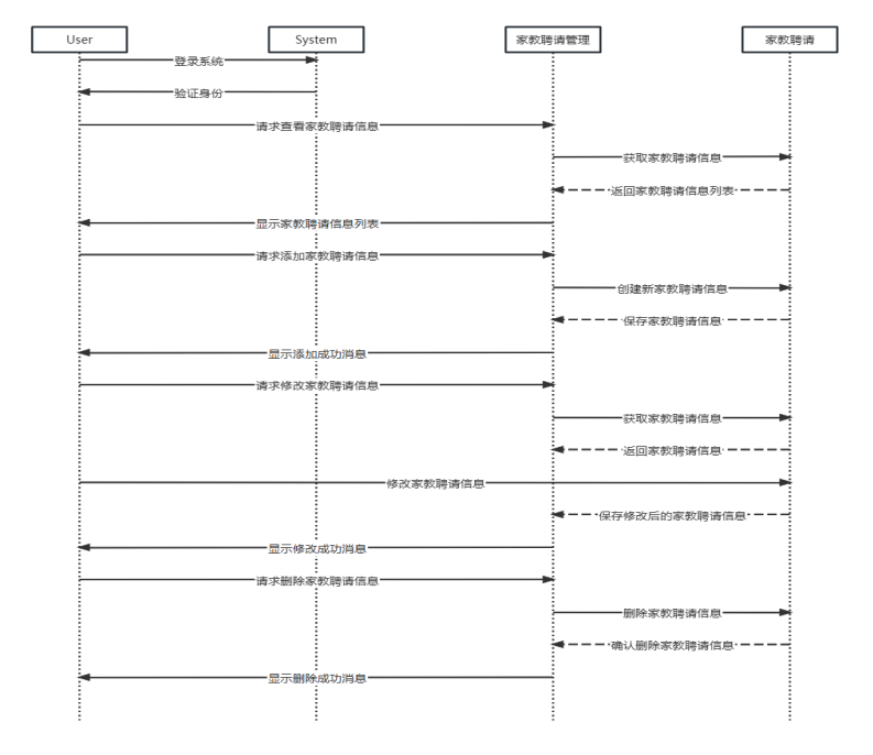 用户首先登录系统并进行身份验证。验证通过后,用户可以请求查看家教聘请信息,系统从家教聘请管理模块获取家教聘请信息并返回列表。用户许可选择添加、修改或删除家教聘请信息,系统执行相应的CRUD操作,并在操控成功后向用户显示消息。这一流程体现了家教聘请管理系统的动态行为和交互过程。家教聘请管理时序图如图4-7所示。