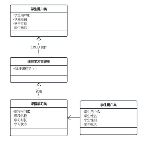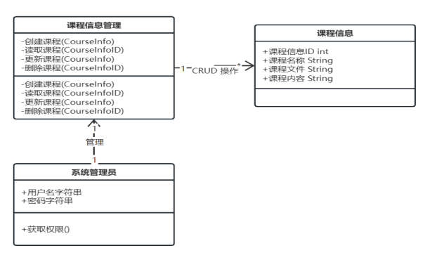 CRUD操作关系。课程信息管理能力类图如图4-9所示。就是该类图展示了课程信息管理系统的结构。系统管理员利用“获取权限”办法与课程信息管理系统交互,管理系统负责处理课程信息的CRUD处理。课程信息类包含课程信息ID、课程名称、课程资料和课程内容等属性。系统管理员与课程信息管理系统之间是管理关系,管理系统与课程信息类之间
