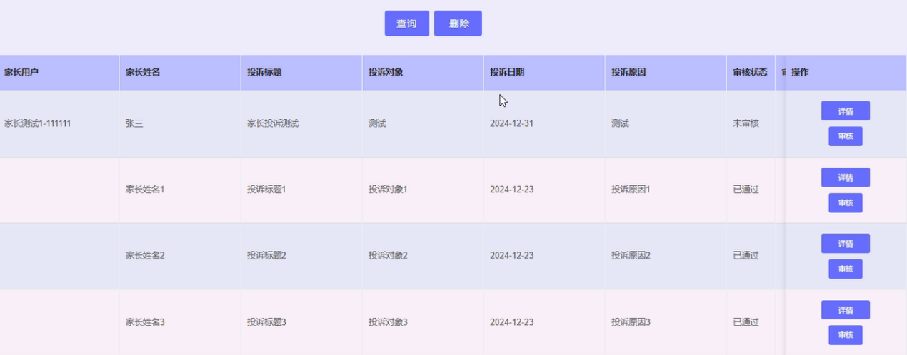 管理员可以查询、删除、添加及审核家长投诉,及时处理用户反馈。家长投诉管理界面如图6-27所示。