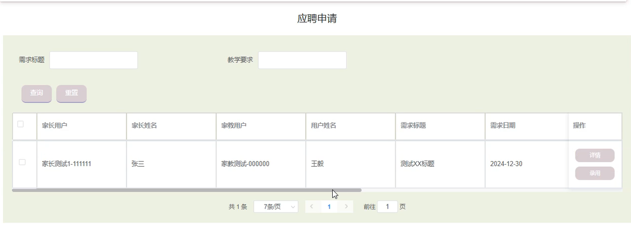通过家长能够查看家教的应聘申请,选择合适的家教进行录用或拒绝,并记录录用过程中的关键细节。应聘申请界面如图6-15所示。