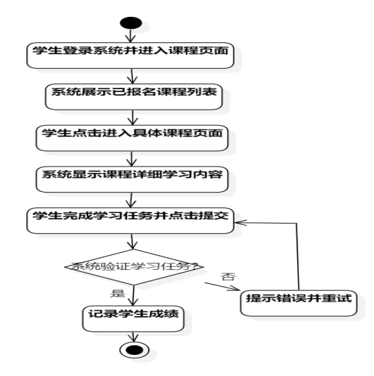 在流程开始时,学生用户登录框架并进入课程学习页面。之后,架构就会展示学生已经报名的课程信息表。当学生选择特定课程时,系统将跳转至课程学习页面,展示课程的详细学习资源,包含教学视频、电子课件以及布置的学习任务等内容。学生完成学习任务后,点击“提交”按钮。系统对提交的学习任务进行验证,并记录学生的成绩。学生可以在课程学习页面查看自己的课程成绩,包括各科目的分数与综合评分,以及家教的评语。学生查看课程成绩活动图如图3-5所示。