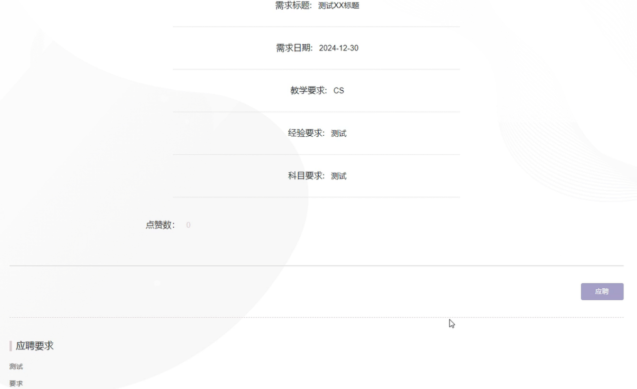 在平台构建部分,本文详细介绍了每个功能模块的具体构建过程,从家教功能到管理员功能,逐一阐述了其操作流程与交互界面。平台通过精确的权限管理和交互设计。为了验证架构的稳定性与功能完备性,论文还进行了全面的测试,涵盖了各个功能模块的功能验证、性能测试与用户交互测试。测试结果表明,体系功能完备,能够满足预期需求,并且稳定运行,未出现重大故障或性能瓶颈。通过本文的设计与实现,可以看出,该平台系统具有较强的实用性与扩展性,能够在未来的实际应用中提供可靠的服务支持。