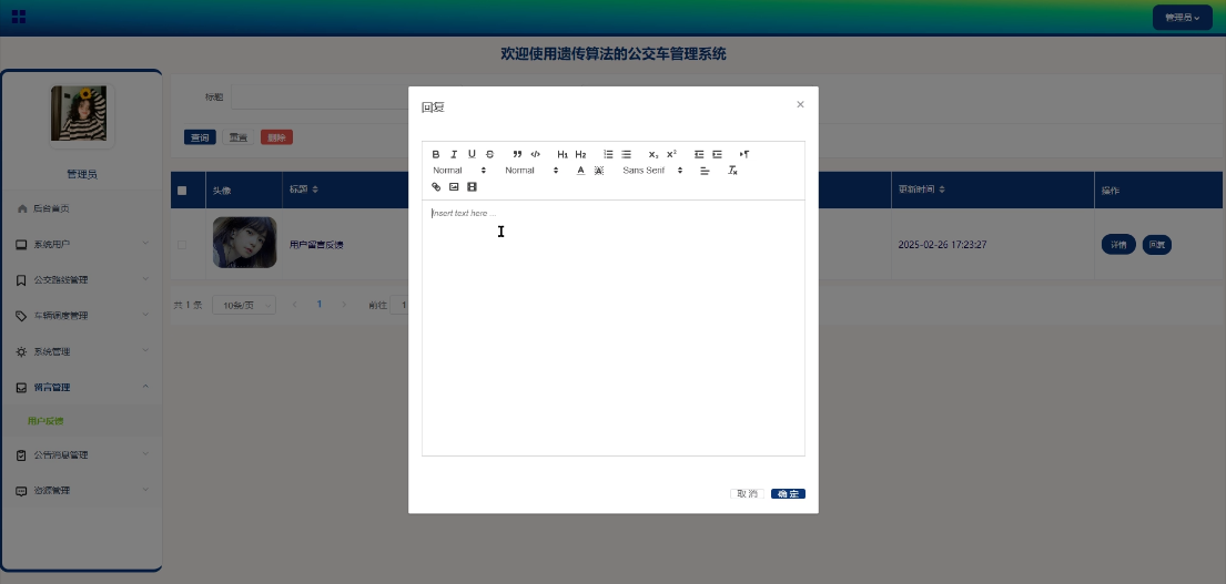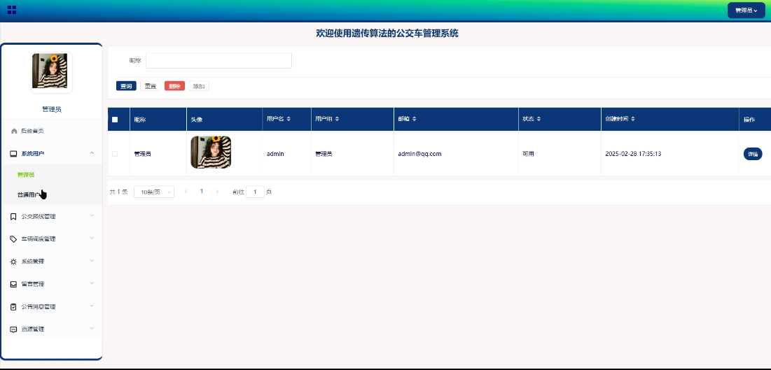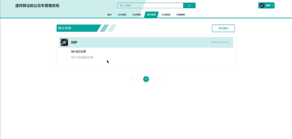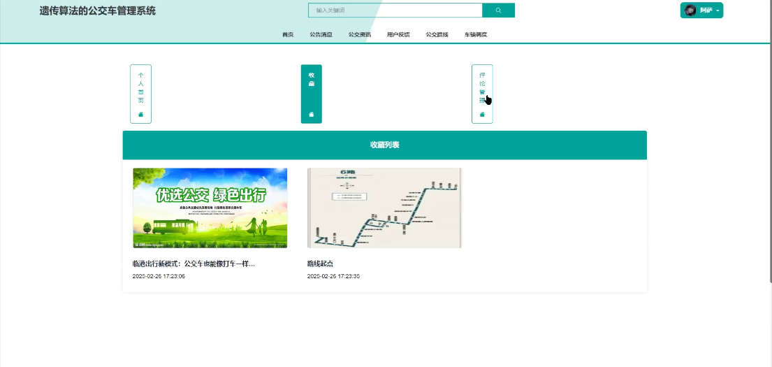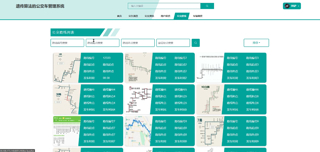 随着城市化进程的不断加快,公交运输成为解决城市交通拥堵的核心手段。然而,传统的公交管理系统在调度效率、资源利用率和用户体验等方面日益显现出局限性。为了解决这些挑战,本研究提出了一种基于遗传算法的公交车管理系统,优化公交路线和车辆调度,以提高公交车辆管理效率和水平,最大程度地满足乘客需求并降低运营成本。在系统开发过程中,首先进行需求分析,以明确系统功能模块,该系统基于Django框架进行系统架构设计,并使用MySQL数据库进行数据存储,采用遗传算法作为核心调度优化方法,通过分析用户历史行为,为用户推荐最适合的公交线路信息。经过测试与调整,确保环境的稳定性和响应速度。最终,体系面对普通用户和管理员两种角色,建立不同的管理权限,达成了注册登录、系统用户管理、公交路线管理、车辆调度管理、系统管理、留言管理、公告信息管理以及资源管理等功能,为公交运营提供了有效的管理工具。基于遗传算法的公交车管理系统的构建可能显著提高公交调度效率,为城市交通管理提供了一种新的思路与途径,具备较高的实用价值与推广意义。