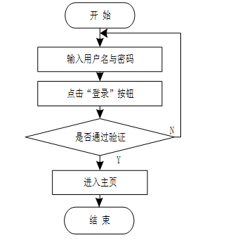 当用户进入登录页面,输入用户名和密码等信息,此时系统将进行基本的输入验证,确认用户名和密码不为空,点击“登录”按钮提交登录请求后,框架将进一步研究用户名和密码是否匹配,验证成功则可成功登录,跳转至用户主界面;反之,提示错误返回登录界面。登录流程图如下图所示。