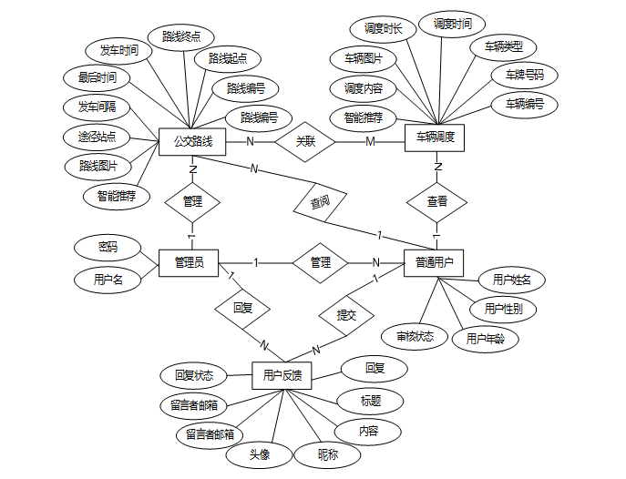 借助系统总体E-R图可以使其他用户快速轻松地了解系统的功能以及他们之间的关系。根据公交车管理系统各个实体和属性的分析结果,本公交车管理系统总体E-R实体关系图如下所示。
