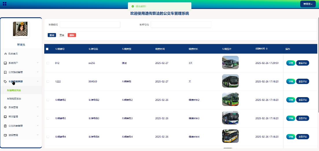 With the continuous acceleration of urbanization, public transportation has become an important means to solve urban traffic congestion. However, traditional public transportation management systems are increasingly showing limitations in terms of scheduling efficiency, resource utilization, and user experience. To address these issues, this study proposes a bus management system based on genetic algorithm, which optimizes bus routes and vehicle scheduling to improve the efficiency and level of bus management, maximize passenger demand, and reduce operating costs. In the process of system development, the first step is to conduct requirement analysis to clarify the system functional modules. The system is designed based on the Django framework and uses MySQL database for data storage. Genetic algorithm is used as the core scheduling optimization method to analyze user historical behavior and recommend the most suitable bus route information for users. By testing and adjusting, ensure the stability and response speed of the system. In the end, the system implemented different management permissions for both ordinary users and administrators, completing functions such as registration and login, system user management, bus route management, vehicle scheduling management, system management, message management, announcement information management, and resource management, providing effective management tools for bus operations. The construction of a bus management system based on genetic algorithm can significantly improve the efficiency of bus scheduling, providing a new idea and method for urban traffic management, and has high practical value and promotion significance.