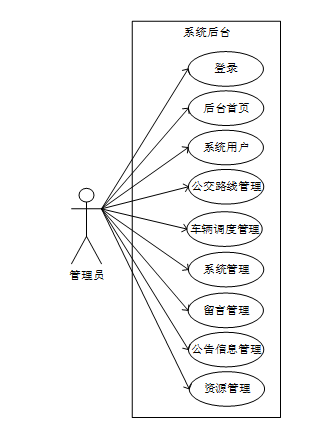公交车管理系统中管理员则集成了登录、后台首页、系统用户、公交路线管理、车辆调度管理、系统管理、留言管理、公告信息管理、资源管理等功能。管理员用例图如下所示: