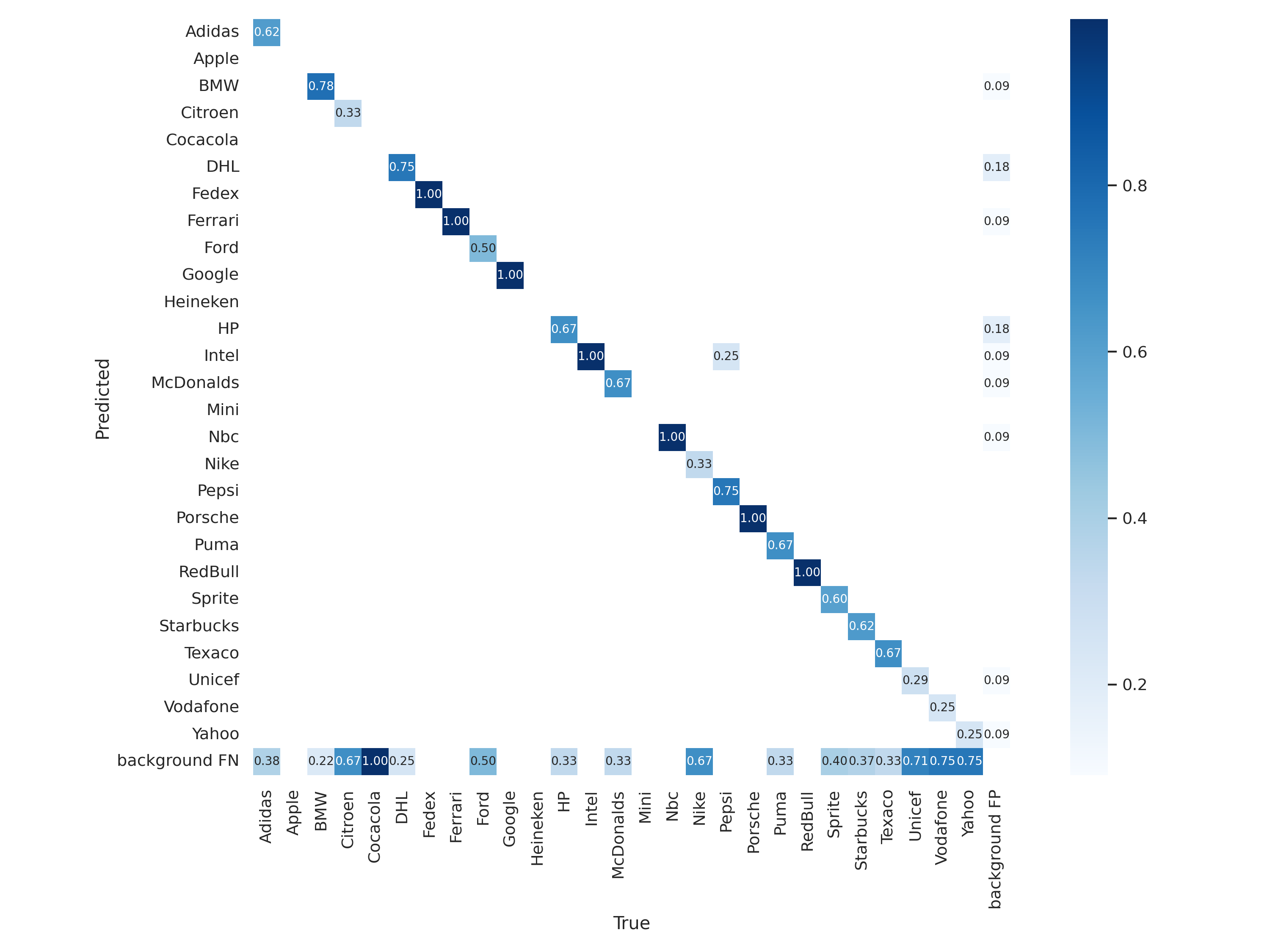 - 作用:展示 27 个 Logo 类别的 “真实标签” 与 “预测标签” 对应关系,可直观发现 “易混淆品牌”(如 Puma 与 Adidas,因 Logo 均含条纹元素);
