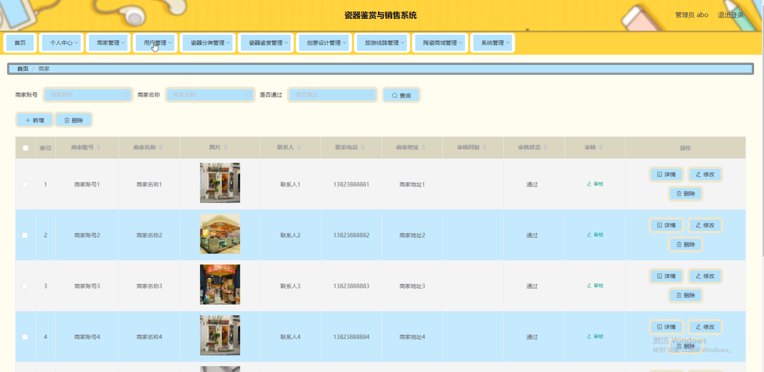 用户,瓷器分类,瓷器鉴赏,创意设计,商家,旅游线路,陶瓷商城