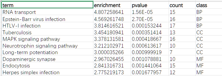 | Fisher Exact | Fisher精确检验的p值,是计算富集显著性的原始统计方式之一。 |