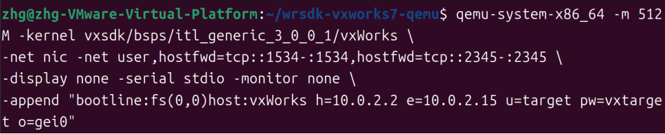 qemu-system-x86_64 -m 512M -kernel vxsdk/bsps/itl_generic_3_0_0_1/vxWorks -net nic -net user,hostfwd=tcp::1534-:1534,hostfwd=tcp::2345-:2345 -display none -serial stdio -monitor none -append "bootline:fs(0,0)host:vxWorks h=10.0.2.2 e=10.0.2.15 u=target pw=vxtarget o=gei0"