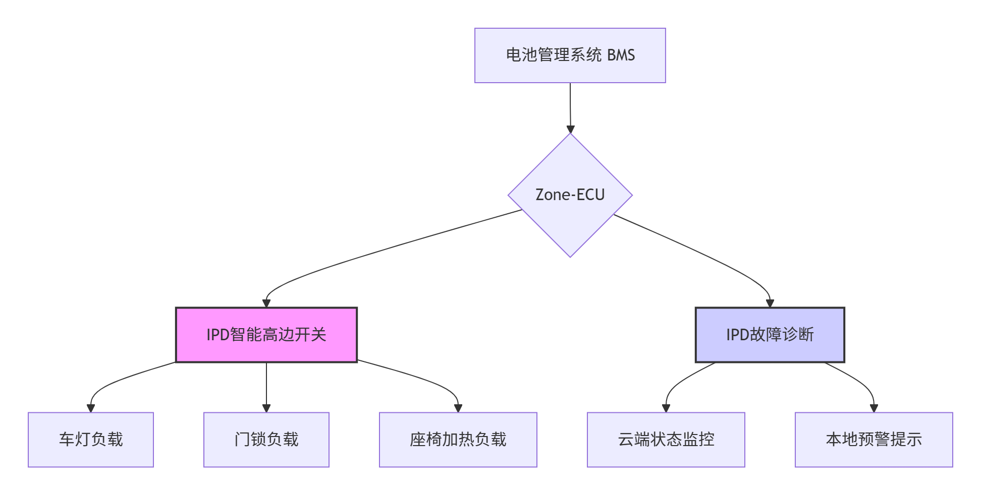 核心应用场景:在广汽埃安等车型中,IPD被广泛应用于引擎控制单元、变速箱控制、BMS和车载电源等系统。以Zone-ECU架构为例,传统分布式ECU正被区域集中控制取代,每个Zone-ECU需管理多个负载,IPD的高集成度和智能保护功能正好满足这一需求。