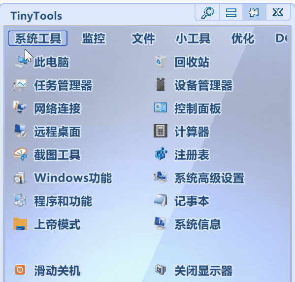 打开主程序后,左侧为分类导航栏,包括:系统器具、监控、文档、小工具、优化、DosBox六大模块。每个模块下集成多个高实用性子程序。
