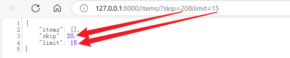 访问链接 http://127.0.0.1:8000/items/?skip=20&limit=15 ,可以看到查询参数被正确解析到了视图函数的关键字参数中。