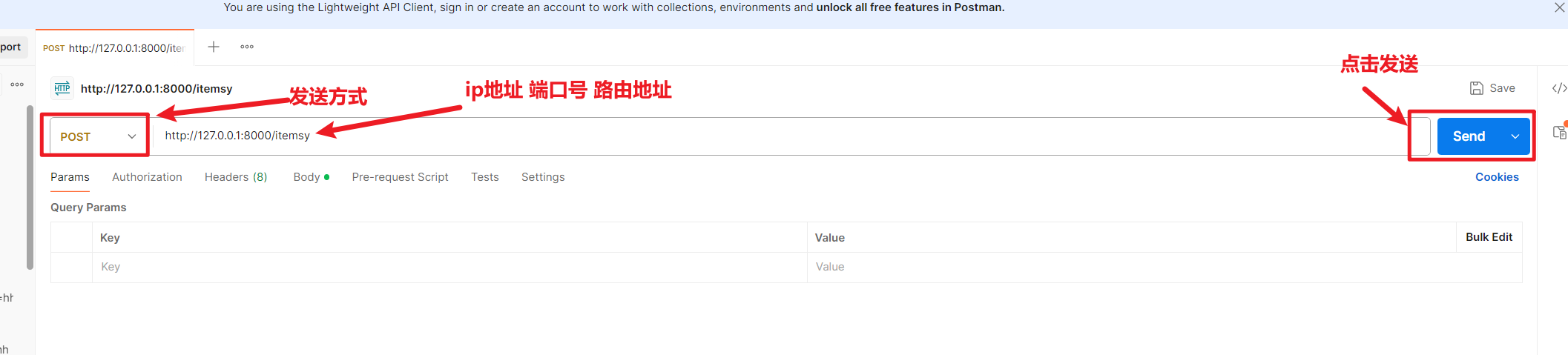 定义请求体需要使用 pydantic 模型,不能通过 GET 请求发送请求体。发送请求体时必须通过以下方法: