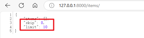 此外,因为我们在定义视图函数时,为查询参数 skip 和 limit 指定了默认值,因此查询参数将变为可选的,缺省时将使用默认值。