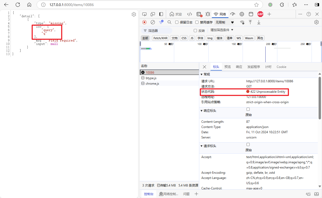 当未指定查询参数 q 时,将收到 FastAPI 返回的错误响应,提示我们 q 为必须的查询参数。