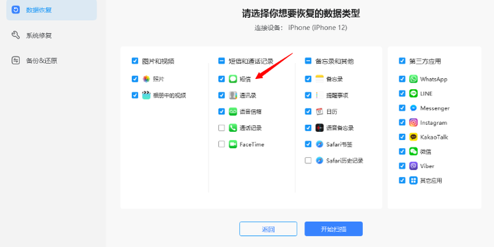 当软件检测到您的设备时,它将显现如下界面。您可以勾选上短信。