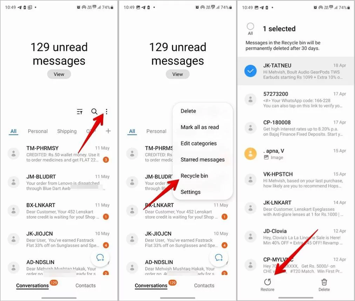 您想知道如何查看已删除的文本吗?许多 Android 智能手机(例如三星)具有本机回收站功能,可将最近删除的消息保留 30 天。从这里,即使没有备份,您也能够访问和检索已删除的消息。