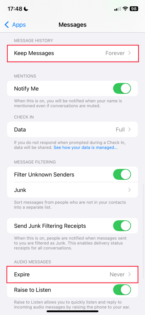 为此,请打开“设置”>“消息”。之后,在“保留消息”下选择“永远”,在“音频消息过期”下选择“永不”。